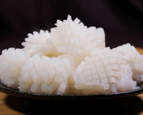 The fresh squid is peeled by hand and use knife to carve the surface patten then quick freezing to keep fresh and crisp taste. After thawing, the carving squid will become crisper, chewy and tender when it cooked. Moreover, squid is rich in protein and low in fat, is a healthy seafood.