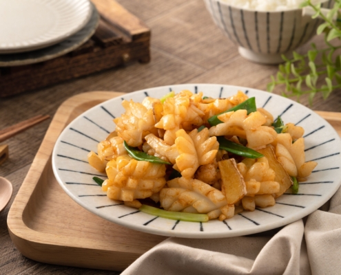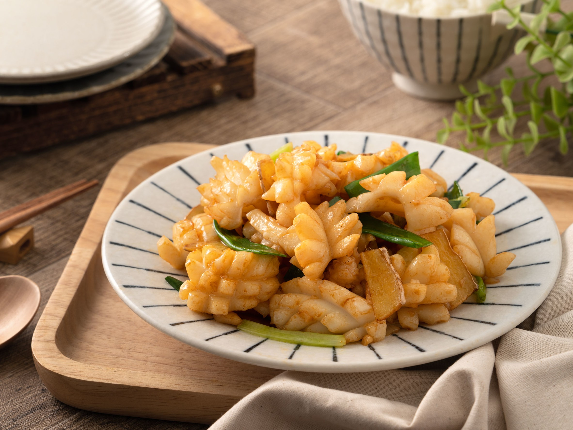 魷魚刻花是將新鮮魷魚,進行手工剝皮表面以刀工刻出紋路處理後再急速冷凍,使其保持鮮味和爽脆口感,退冰後即可料理,魷魚刻花透過烹煮後肉質會更加爽脆、Q彈有嚼勁!魷魚富含蛋白質,脂肪含量低,是健康的食材。